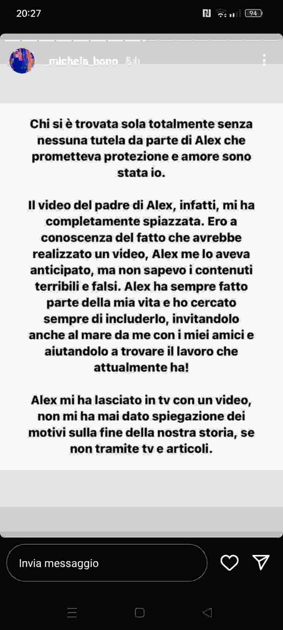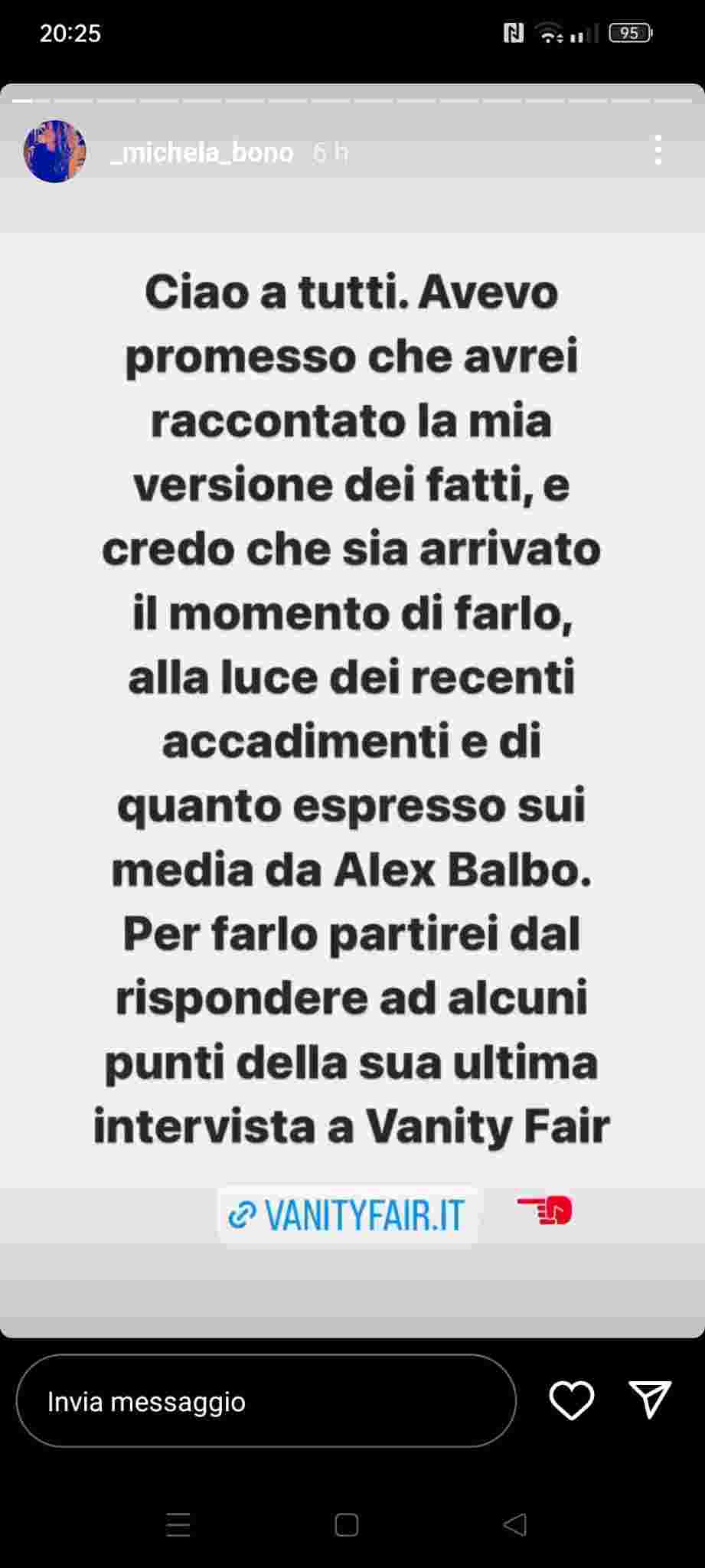 Michela tagga Vanity Fair che ha concesso ad Alex un’intervista esclusiva, questo però l’ha tagliata fuori dalla possibilità di replica. Per questo le stories sono particolarmente incisive e dirette, al fine di spiegare il suo punto di vista estromesso su più fronti agli occhi dei follower e telespettatori del docu-reality.