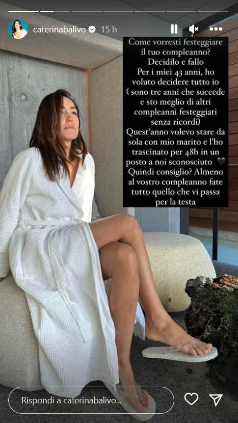 Dopo le prime stories in cui racconta di aver staccato il cellulare per qualche ora di relax-detox, Caterina rivela anche dopo tanti anni in cui si è sentita soggiogata per il compleanno e non ha portato nessun ricordo nel suo cuore, da tre anni finalmente sta facendo l’egoista e decide unicamente lei che cosa vuole fare per il suo giorno speciale. “Quest’anno volevo stare da sola con mio marito e l’ho trascinato per 48 ore in un posto a noi sconosciuto!“.